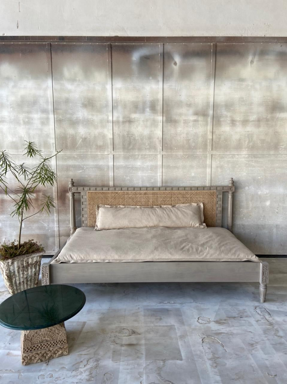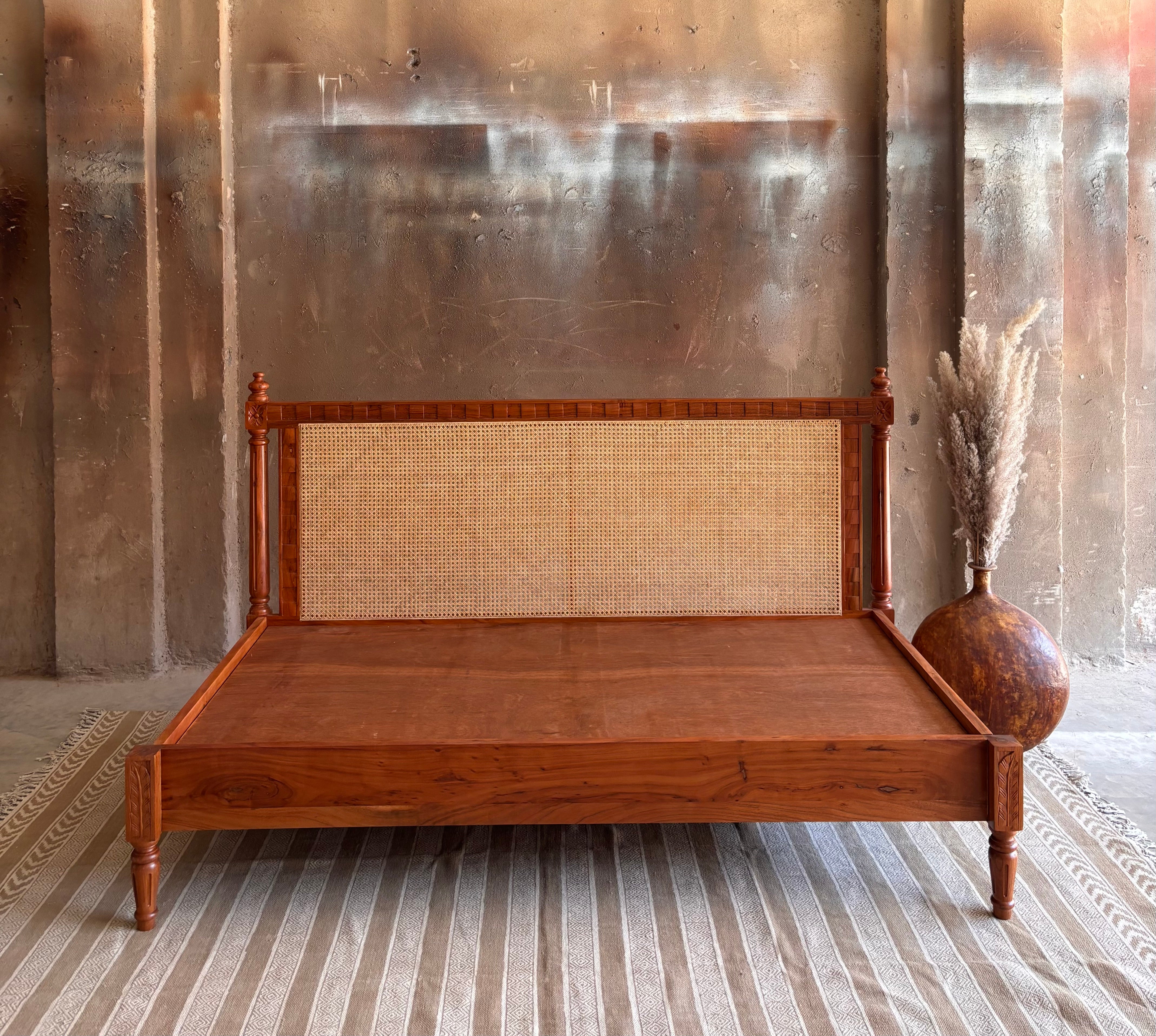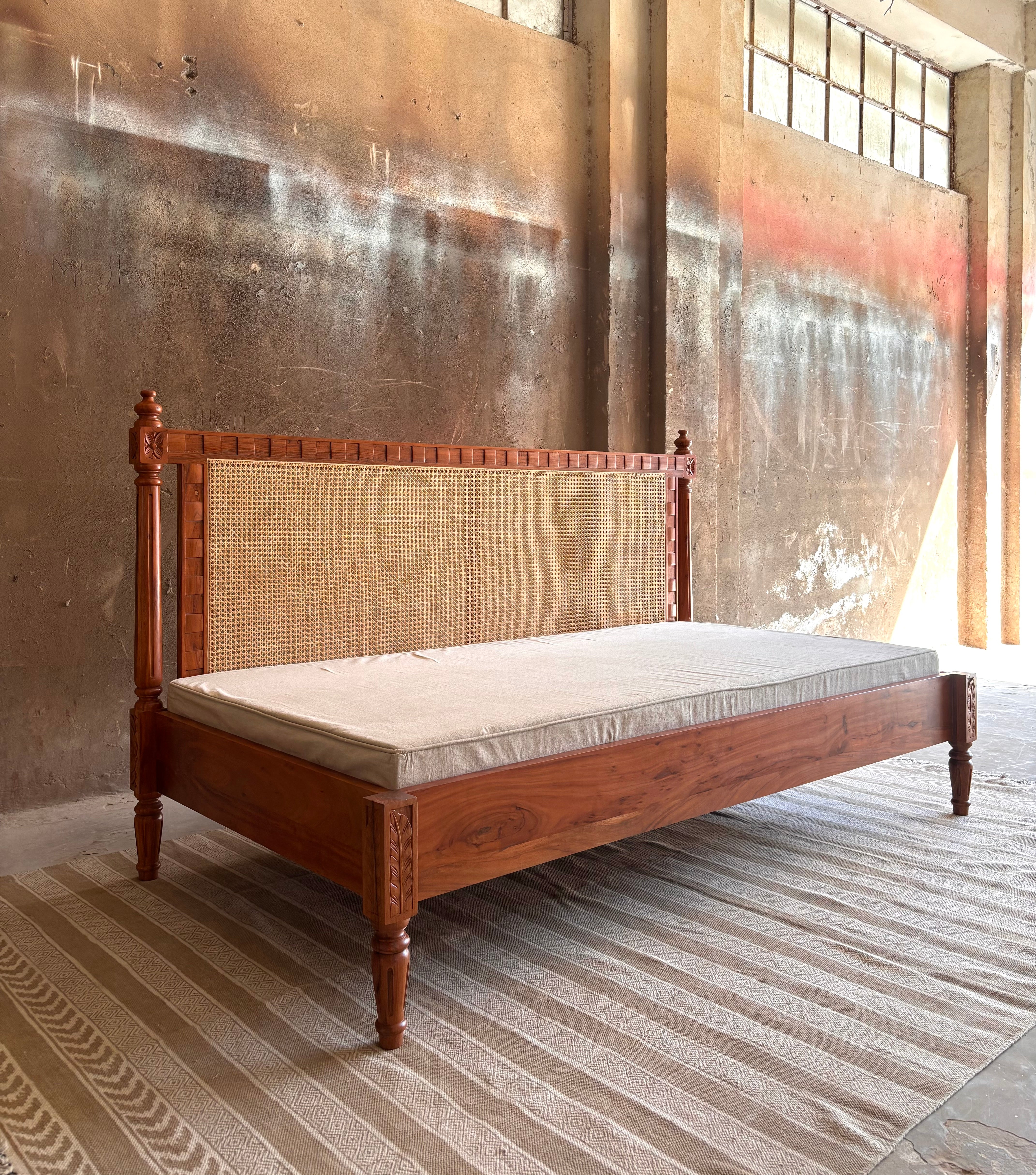 Made using solid acacia wood, this bed features a simple rattan back, rustic carving and wooden posters. It comes in a gorgeous matte beige finish. We provide the option of a simple cotton-filled mattress and cushion along with the bed.