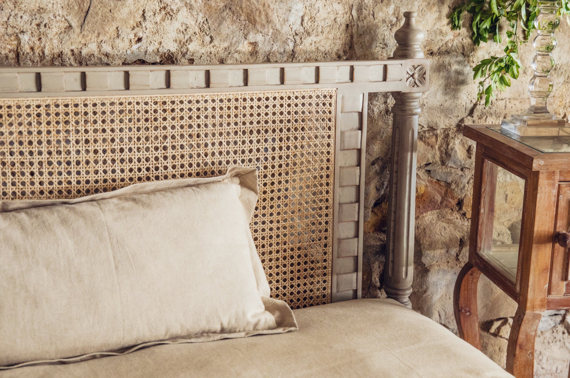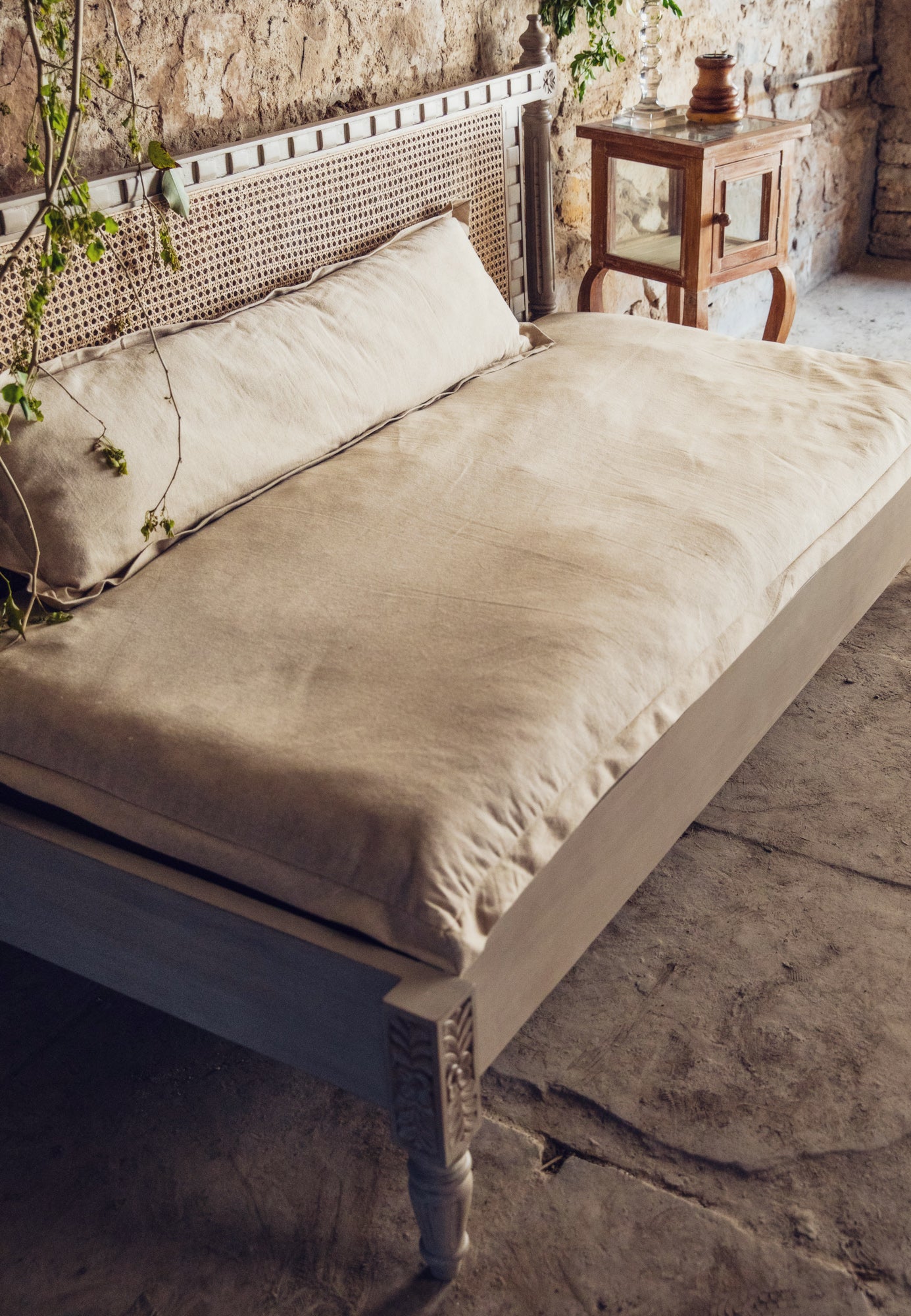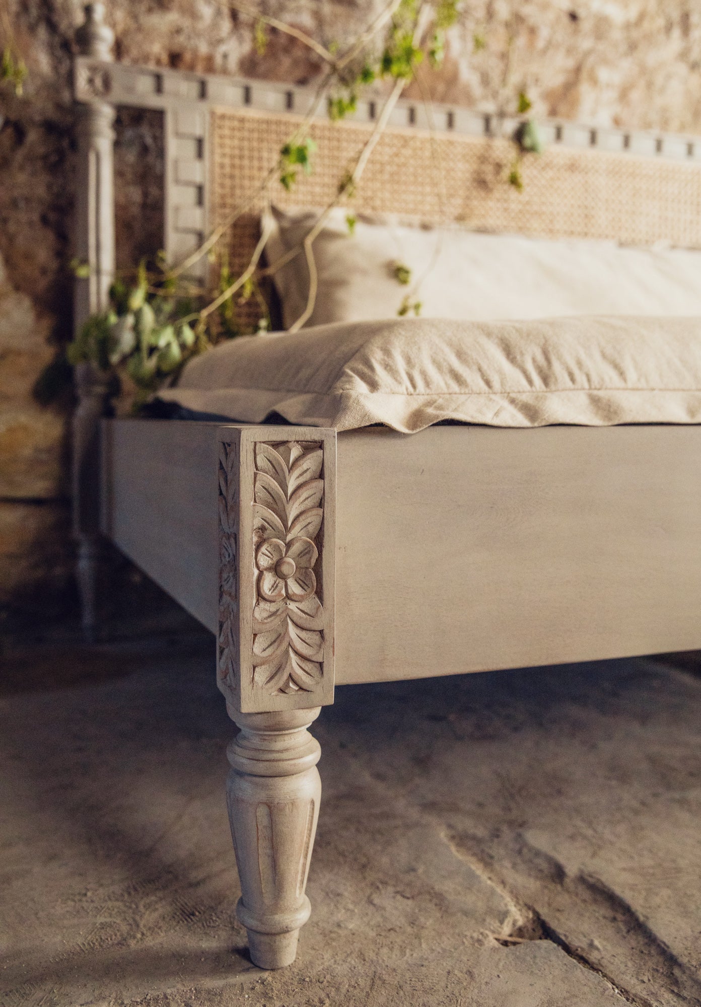 Made using solid acacia wood, this bed features a simple rattan back, rustic carving and wooden posters. It comes in a gorgeous matte beige finish. We provide the option of a simple cotton-filled mattress and cushion along with the bed.