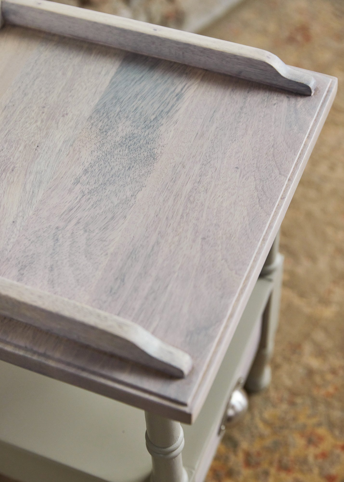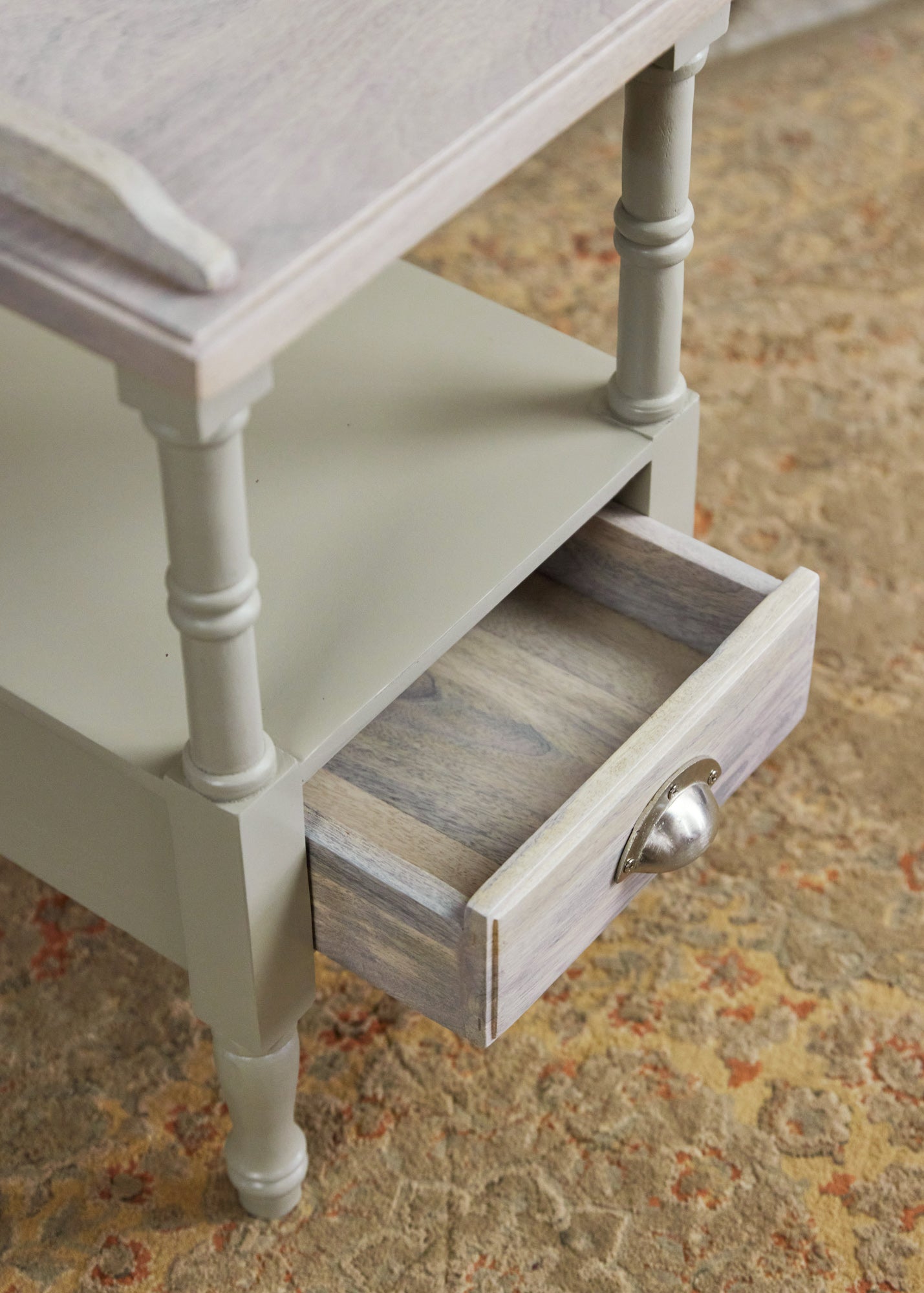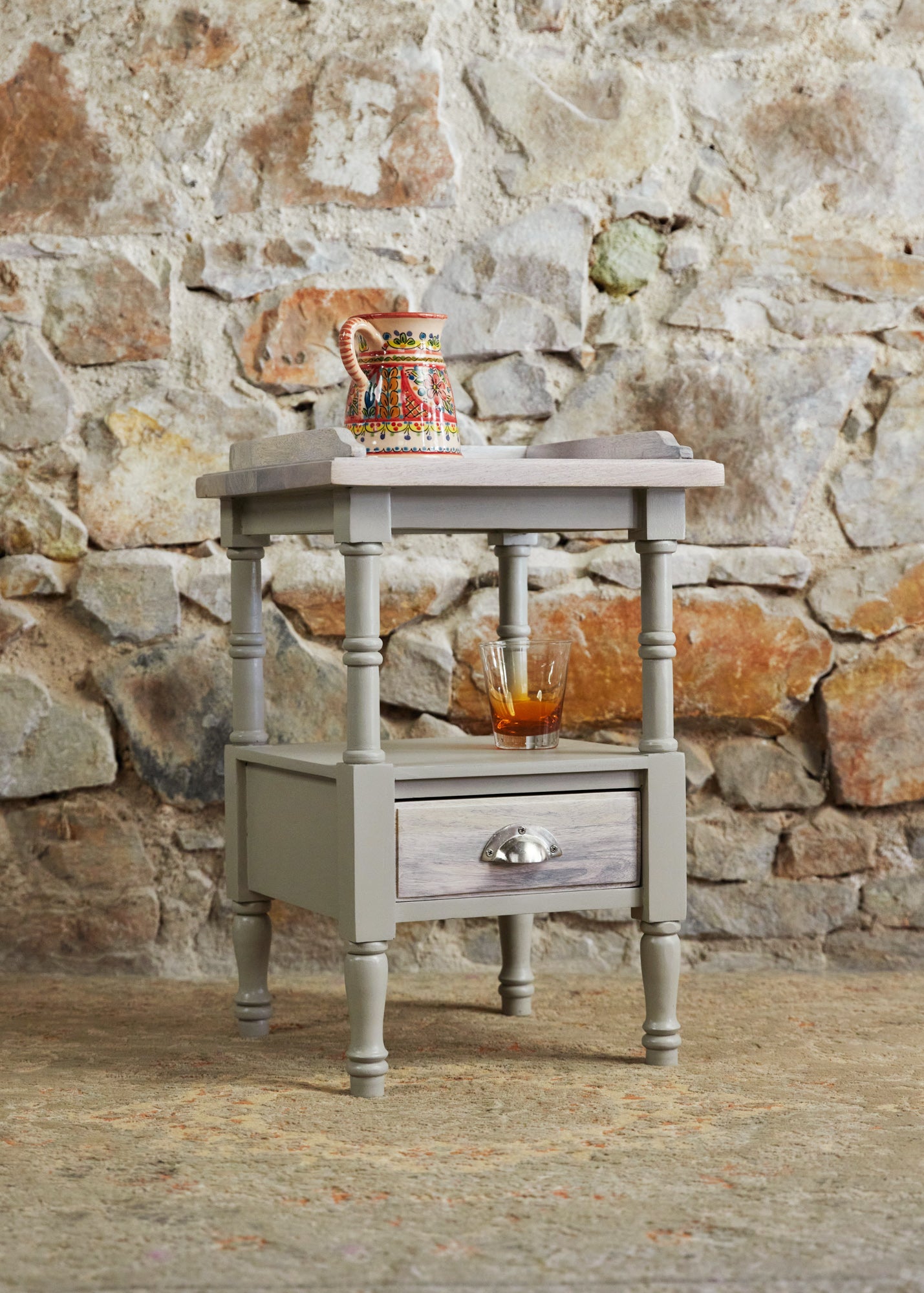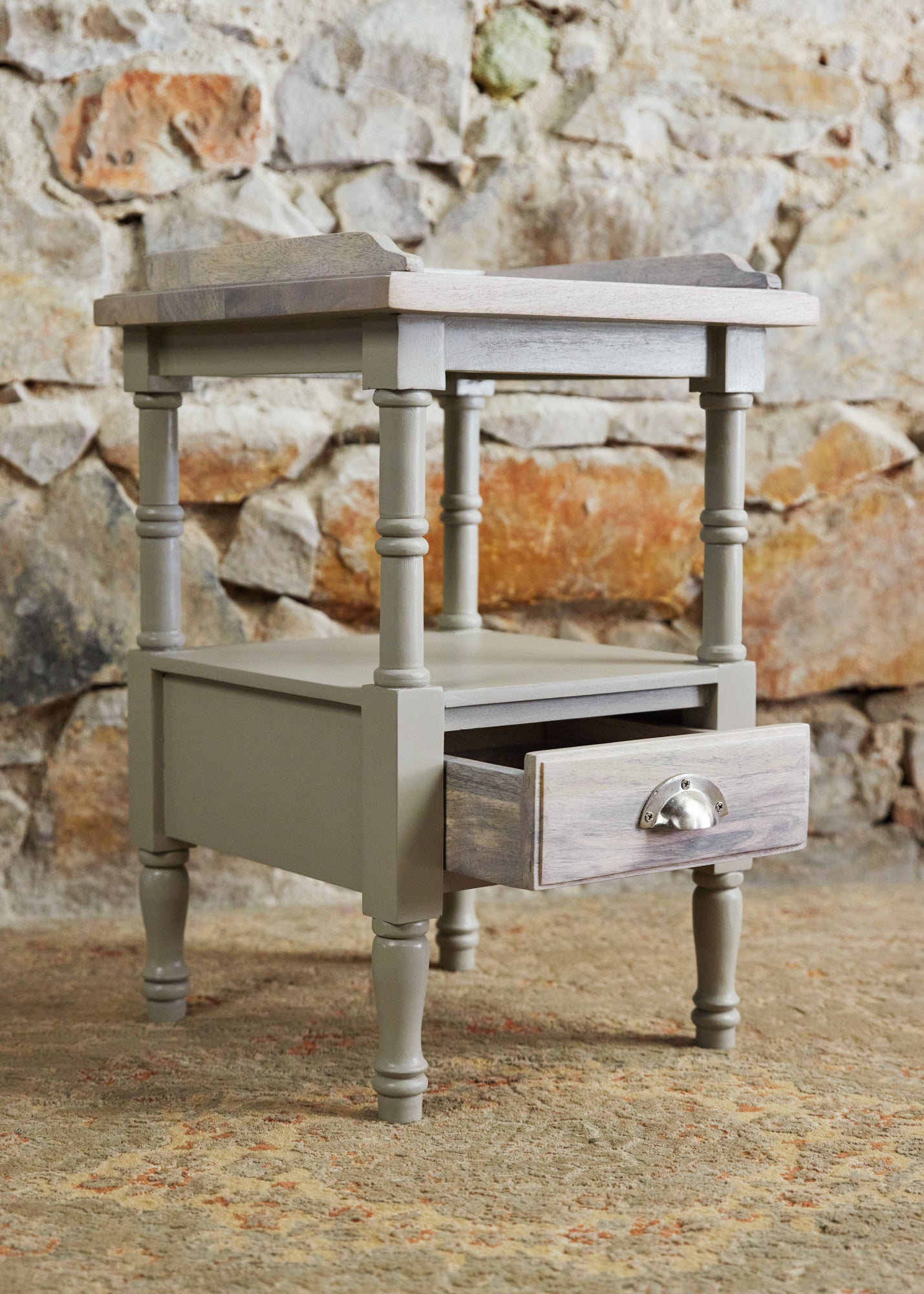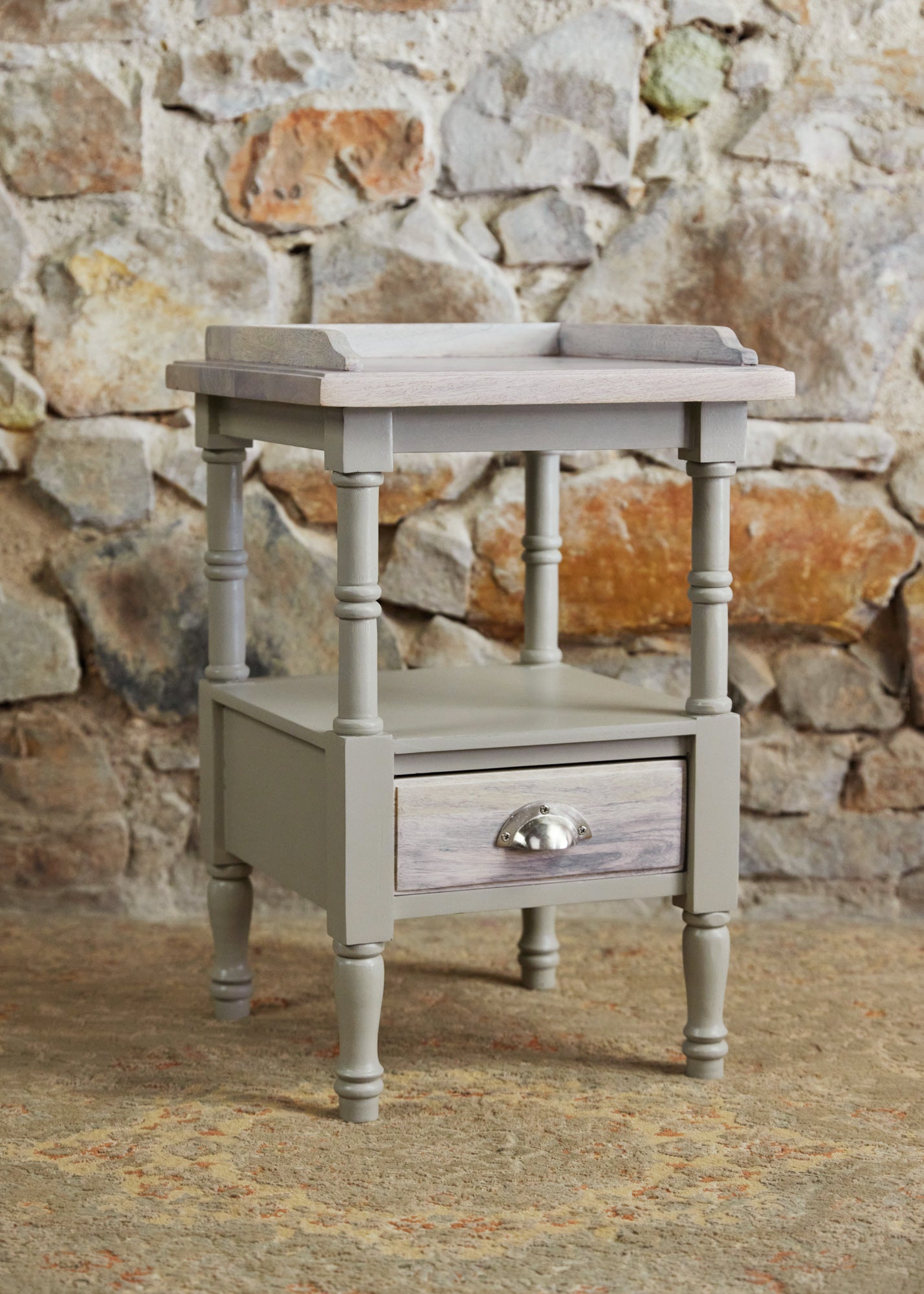 This poetic bedside table adds charm and beauty to any room. With daintily carved legs, a slide-out tray and a drawer, it offers utility with elegance.